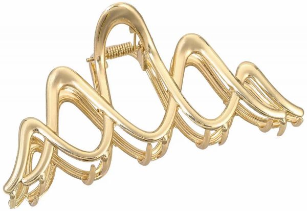 Die Haarklammer – Golden Waves schimmert goldfarben und hat eine glänzende Oberfläche. Das Metall ist gebogen, sodass die Haarklammer eine Optik von mehreren Wellen hat. Besonders gut lässt sich das Accessoire zu halboffenen Frisuren kombinieren. Haarklammer Goldfarben Wellen Glänzende Oberfläche Länge: 12 cm Breite: 2,3 cm