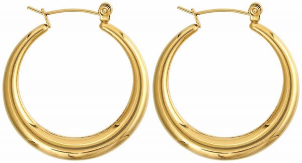 Die Creolen – Golden Steel schimmern goldfarben und bestehen aus Edelstahl, weshalb sie gegen das Anlaufen von Wasser geschützt sind. Diese klassischen Creolen sind ein wahres Must-Have, denn sie lassen sich zu unzähligen Looks kombinieren. Creolen Goldfarben Edelstahl Wasserfest Durchmesser: 3 cm Breite: 0,5 cm