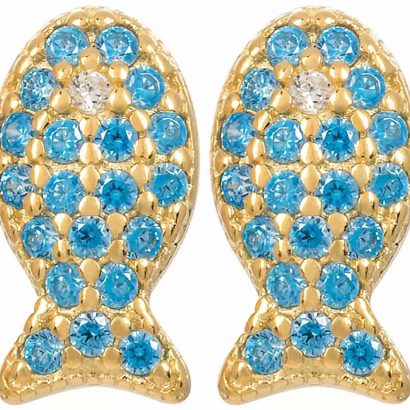 Ohrstecker – Blue Lake schimmern goldfarben und bestehen aus 925er Echtsilber. Die Oberfläche ist vergoldet. Sie sind in der Form von Fischen designt und sind mit hellblau funkelnden Cubic Zirkonia Steinen beschmückt. Ohrstecker Goldfarben, Hellblau 925er Echtsilber Cubic Zirkonia Fisch Länge: 0,8 cm Breite: 0,4 cm